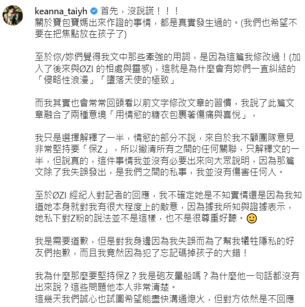 至於為什麼她之前只解釋了一半,她則透露,「來自於我不顧團隊意見非常堅持要『保Z』,所以撇清所有之間的任何關聯」,而該篇貼文不僅是失誤公開,也是兩人之間的私事,所以原先並沒有打算要詳細解釋。