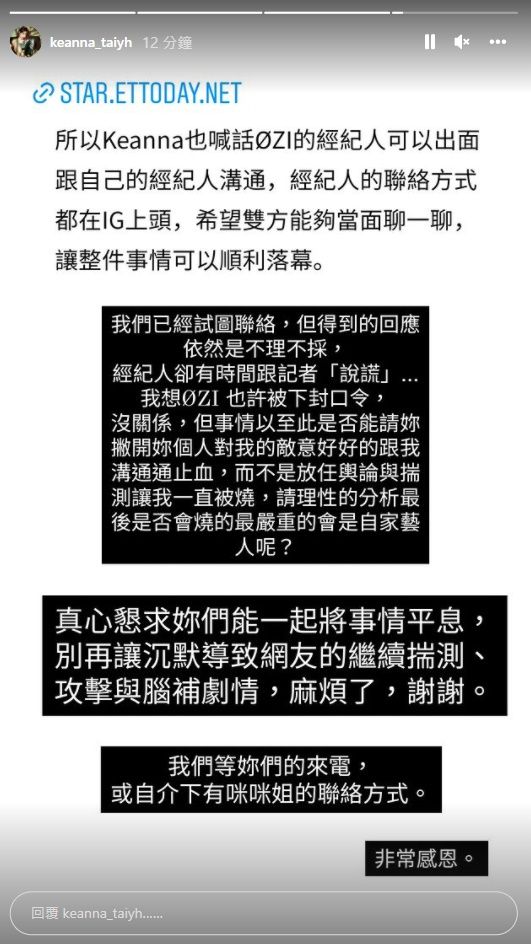 最後,Keanna無奈向ØZI經紀人喊話,「真的懇求你們能一起將事情平息,別再讓沉默導致網友的繼續揣測、攻擊與腦補劇情,麻煩了,謝謝。」希望對方能夠放下個人的敵意,好好的溝通止血,而不是放任輿論及不實的猜測繼續延燒。