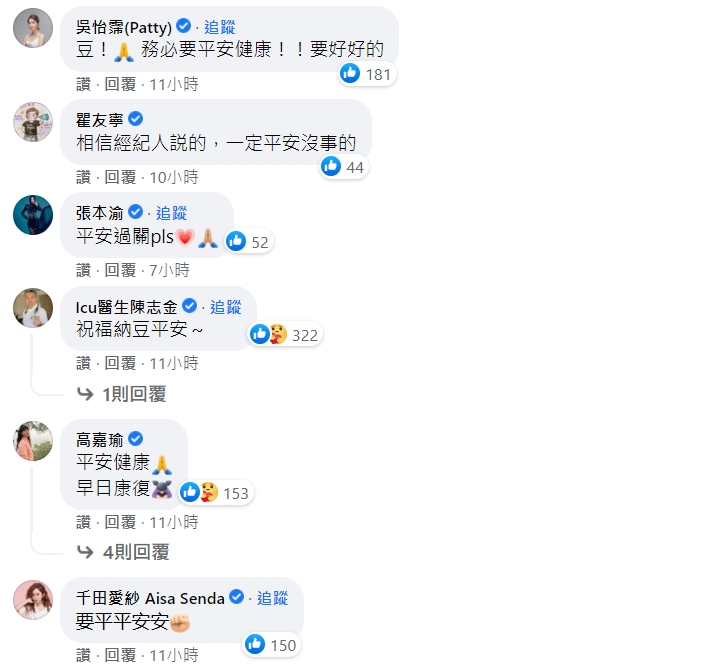 納豆送醫的消息曝光後,許多藝人及網友立刻湧入納豆的社群平台為他加油打氣,「豆哥,平安健康!」、「祝早日康復出院,我們等你」、「納豆兄弟,早日康復,大家等你的好消息~」、「早日康復,還要一起拍戲,一起聊戲!」而昔日的主持搭檔「陶晶瑩」也在個人的臉書標記納豆,並祝福表示「希望你平安」,希望納豆收到大家的祝福後能夠早日康復,好好休息後再回到螢光幕前帶歡樂給大家!