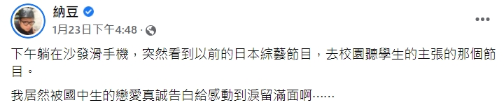 其實,納豆在前一天(23日)才在臉書發文表示,「下午躺在沙發滑手機,突然看到以前的日本綜藝節目,去校園聽學生的主張的那個節目,我居然被國中生的戀愛真誠告白給感動到淚留滿面啊~」原本還好好的在回憶過去,沒想到隔天卻無預警病倒,讓大家都十分擔心且心疼。