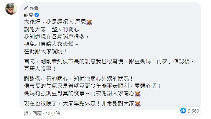 藝人納豆24日驚傳腦出血而緊急送往醫院治療,先前更傳出他被送到醫院時,因出血過多導致無法開刀,只好用引流管減緩腦部的血壓,情況似乎不太樂觀!消息曝光後,許多藝人、網友及舅舅侯友宜都出面關心,而納豆經紀人雖已多次出面解釋「真的沒事」,但不實謠言仍鬧得沸沸揚揚,稍早經紀人再度透過納豆臉書發聲明稿,掀起熱議!
