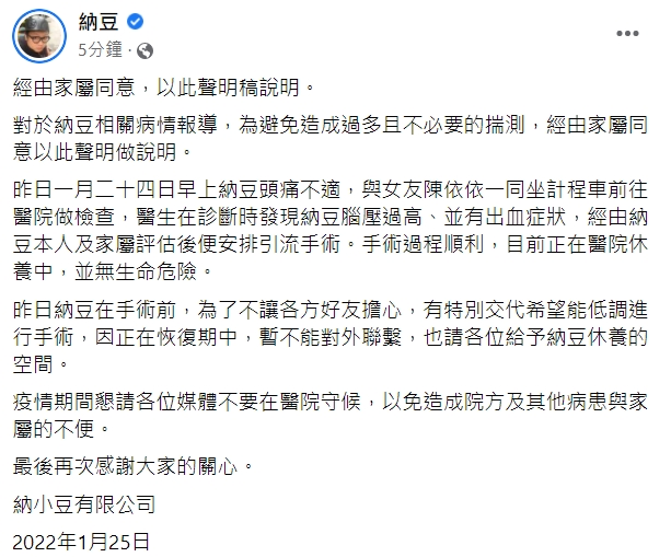 後來,經紀人為了避免不必要的傳聞,在25日獲得納豆家屬的同意之後,發了聲明稿還原狀況,「昨日一月二十四日早上納豆頭痛不適,女友陳依依一同坐計程車前往醫院做檢查,醫生在診断時發現納豆腦壓過高、並有出血症狀,經由纳豆本人及家屬評估後便安排引流手術」,經紀人也強調,「手術過程順利,目前正在醫院休養中,並無生命危險。」也提到納豆現在正在恢復期,「暫時不能對外聯繫」,並呼籲大家不要守在醫院外,以免造成其他人的不便,最後也謝謝所有人的關心。