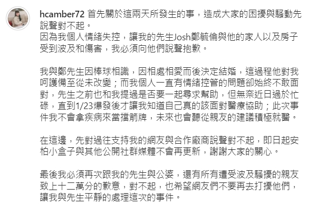 事情延燒多日,Amber也在25日發文道歉,「因個人情緒失控,讓我的先生Josh鄭毓倫與他的家人以及房子受到波及和傷害,我必須向他們說聲抱歉。」她也解釋,自己一直以來都有情緒控管的問題,Josh曾提過要一起尋求幫助,直到1月23日的事件爆發後,她才正視到這件事情的重要性!