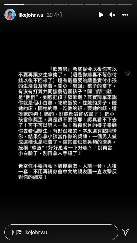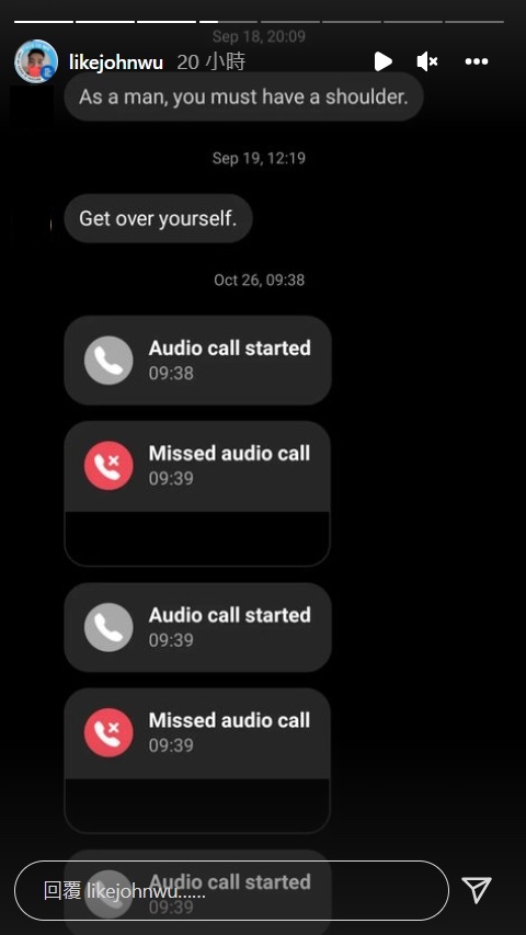 不僅如此,John隨後貼出有網友在留言區對他大罵髒話,還說他是「軟渣男」,並指控他向理科太太要錢又私下騷擾網友,更扯的是,對方甚至利用IG的通話功能瘋狂打電話騷擾,讓John氣得公開所有內容,並希望對方能夠提出證據與他聯繫。