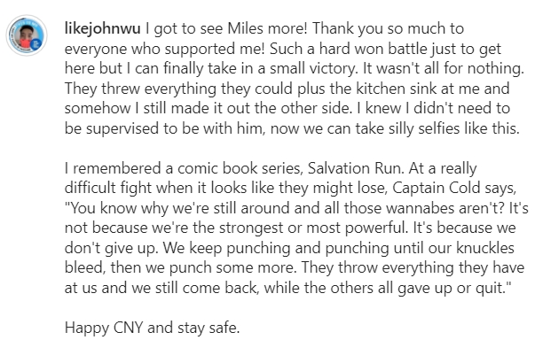 John於28日在IG上曬出於兒子互動的影片,只見影片中父子倆時而面對鏡頭做鬼臉,時而又親密的玩在一起,看起來感情非常好!他在文中先是謝謝大家的支持並接著表示:「雖然經歷一場艱苦的戰役,但最終還是贏得小小勝利」,如今再也不用受到監視就能與兒子互動,感覺得出來他已經非常滿足。