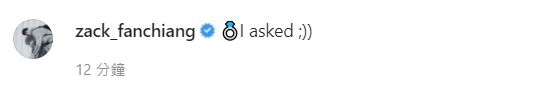 粿粿與范姜彥豐戀愛傳言許久,只不過兩人始終未親口承認,怎料7日兩人在IG上突然曬出親密合照,並秀出無名指上的超大鑽戒,開心用英文寫下:「他問了!」而男方則是「我問了!」正式宣布求婚成功的喜訊!