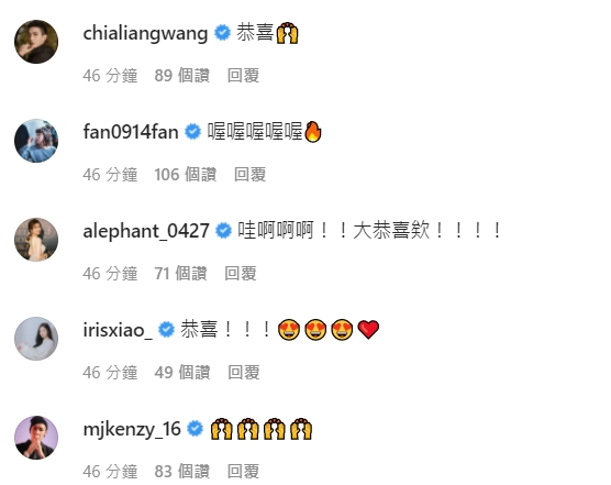 結婚喜訊公布後,立刻湧入許多「藍勾勾」及網友刷一排留言祝福,「恭喜你們~」、「太閃了」、「哇哇!恭喜!太感人了~」、「我相信你會疼她」、「恭喜米果!永浴愛河~」、「希望你們一直甜蜜下去,恭喜!」