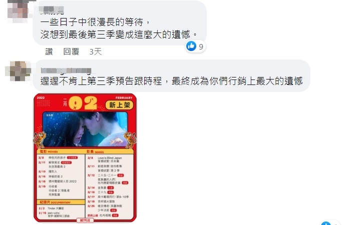 另外,有許多網友看到官方遲遲不公布第三季上線的時程,卻還一直更新圖文炒熱度,氣得在留言區痛罵,「不要再發了,要發文就告知哪時第三季!」、「被靠北成這樣,還一直發這種圖不上第3季也是厲害~」、「不公告什麼時候上片,一直發廢文」、「真的直接熱度變成零,最後知道兇手也好像還好了」、「第三季要等蘇媽媽對年才播嗎?」
