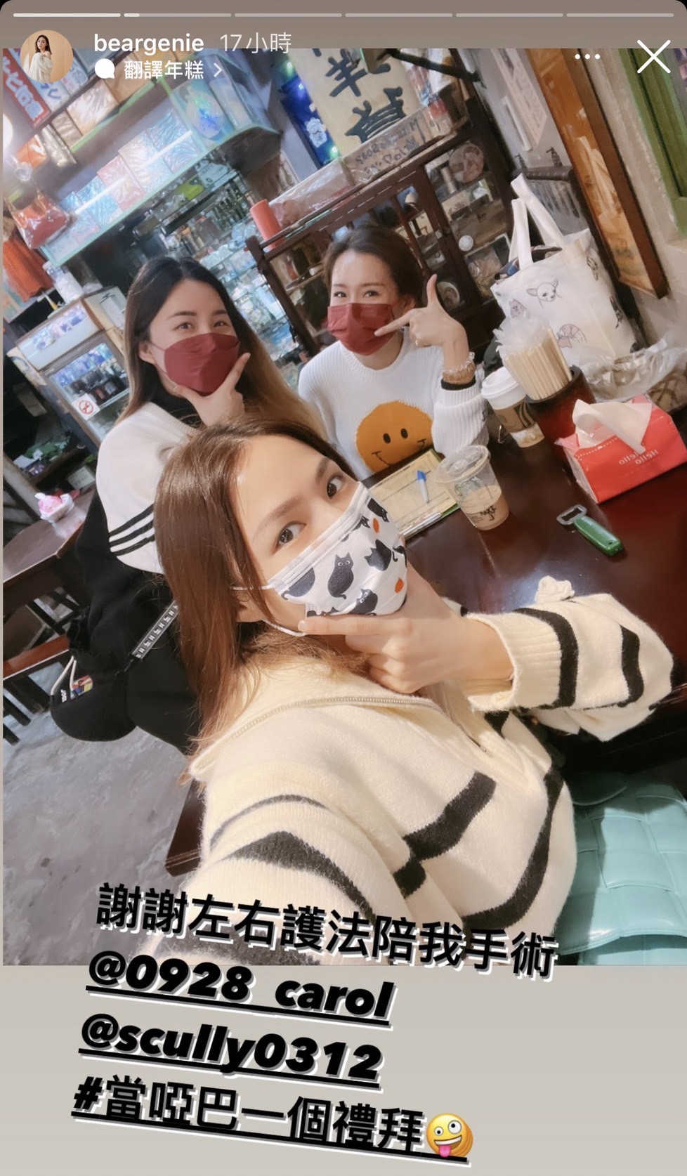 時隔幾小時,她再度曬上與朋友們的合照,透露有她們相隨的手術進行得非常順利,感激道「謝謝左右護法陪我手術」,而這次術後的痊癒路程,必須要「當啞巴一個禮拜」,不過也因為有了休息時間,可以趁機會窩在家裡看劇,表示「看了Tinder又看了瀑布,滿足了~晚安,明天再繼續看殭屍校園。」