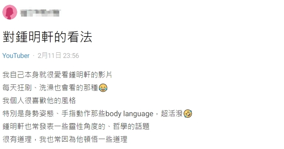 有網友在Dcard上以「對鍾明軒的看法」為標題,分享喜歡鍾明軒的原因,也好奇其他網友對他的看法。原PO表示自己熱愛鍾明軒影片的程度是「每天狂刷、洗澡也會看的那種」,喜歡他的影片風格、身體動作,再加上他時常分享靈性、哲學等話題,讓原PO得到了一些啟發,深深被影響。此外基於好奇,便想知道其他人對於鍾明軒的評價如何,也希望大家能夠理性且善意的發表個人意見。