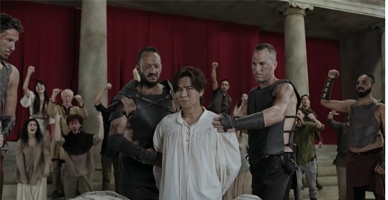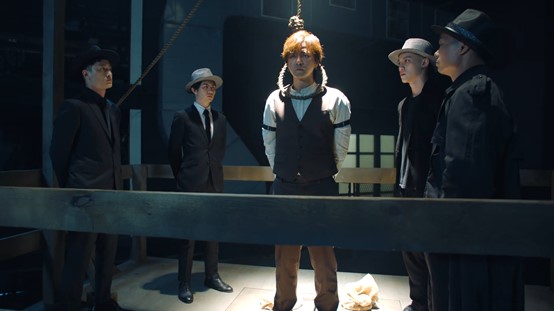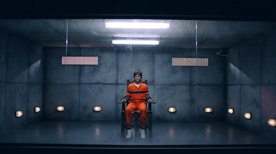 接著,他狼狽地跪在地板上,身後一群人不斷高聲呼喊,似乎是在慫恿事情發生,而轉場的過程中還不時穿插著「一念天堂」、「一念地獄」、「善惡只在一念之間」,看了讓人十分好奇MV想要傳達的概念!
