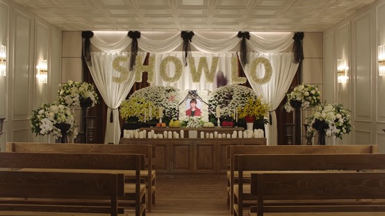 值得一提的是,預告的最後一個畫面是停在「靈堂」,仔細一看可以發現中間擺放的照片正是羅志祥,背後還有用鮮花拼成的SHOW LO,雖然布置的氣派莊嚴,但現場卻沒有人在為他弔念,氣氛感覺起來相當詭異!