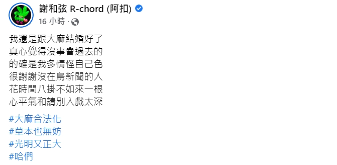 此外,謝和弦17日也在臉書發文寫道,「我還是跟大麻結婚好了,真心覺得沒事會過去的,的確是我多情怪自己色,很謝謝沒在鳥新聞的人,花時間八掛不如來一根,心平氣和請別入戲太深」。看似是一篇抱怨文,實際上卻暗藏玄機的「藏頭詩」,只要將每一句第一個字組起來便會是「我真的很花心」,處理事情的態度讓人摸不著頭緒,讓不少人認為他是在提油救火!