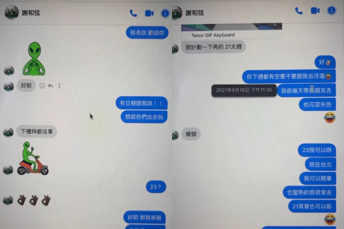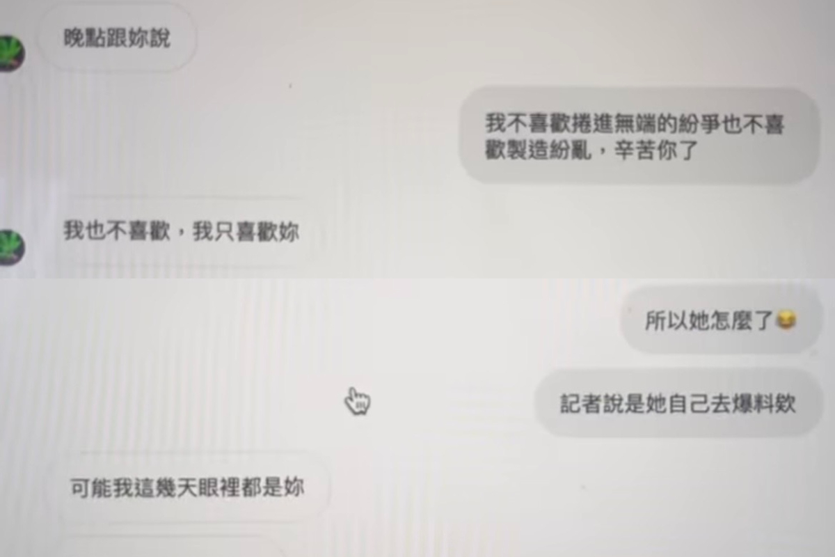 而針對較有爭議的部分,祈錦鈅也貼上詳細的對話內容,圖中她約謝去浮潛,而後就是一連串交代事項,前後文看起來就是普通的邀約。祈錦鈅也附上事發後兩人的完整對話,她向謝和弦表明自己的心聲:「我不喜歡捲進無端的紛爭也不喜歡製造紛亂」謝和弦見狀則回應「我也不喜歡,我只喜歡妳。」而當祈錦鈅再向他問莉婭為何做出此舉?謝則回應「可能我這幾天眼裡都是妳」。