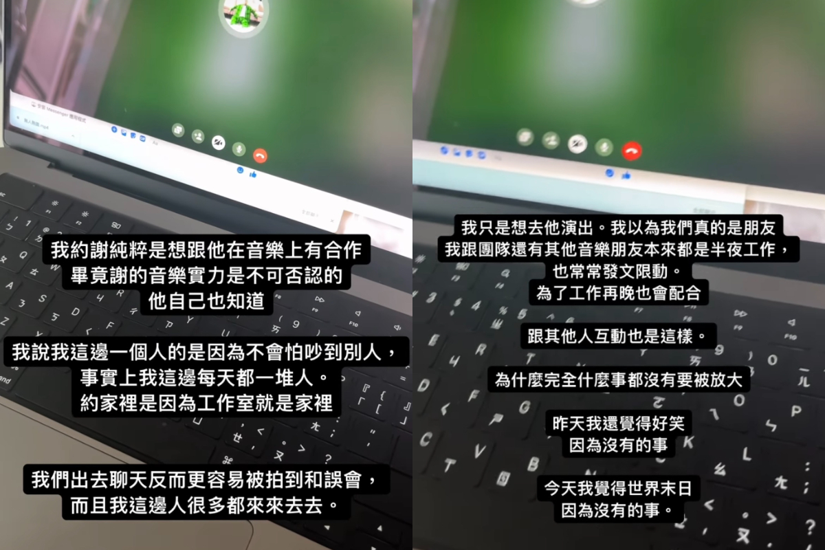 祈錦鈅也做出總結說明,她提到之所以會約謝純粹是因為他在音樂上的實力,而工作室就是在家裡,一整天人很多也來來去去。並強調兩人真的只是朋友,她跟她的團隊也經常在半夜工作,跟其他人的互動也一直以來都是這樣,不懂為何所有事都被放大了。
