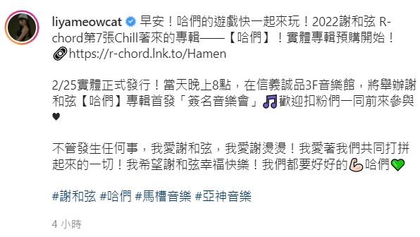 謝和弦17日爆出已經向莉婭提出離婚的事情,不過莉婭則低調回應兩人關係「正在處理中」,也坦言目前已經暫時分居,讓彼此都有空間可以冷靜。雖然感情出問題,但身為男方經紀人的莉婭,仍在社群上替謝和弦宣傳新專輯,還甜蜜表示,「不管發生任何事,我愛謝和弦,我愛謝燙燙!我愛著我們共同打拼起來的一切!我希望謝和弦幸福快樂!我們都要好好的」。