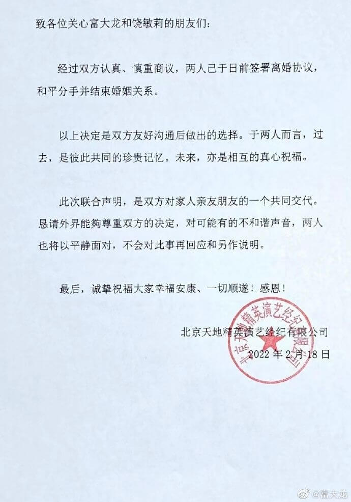 當年富大龍透過化妝師介紹饒敏莉之後,兩人陷入愛河,2010年攜手踏入禮堂,但當時也沒多少網友知道此消息,結果12年後突然宣布離婚,在兩人共同發表的離婚聲明中,他們表示「一切更美好,彼此珍重」,強調雙方是在慎重討論後和平分手,發出聲明是為了給親朋好友一個交代,之後不會再針對此事回應。