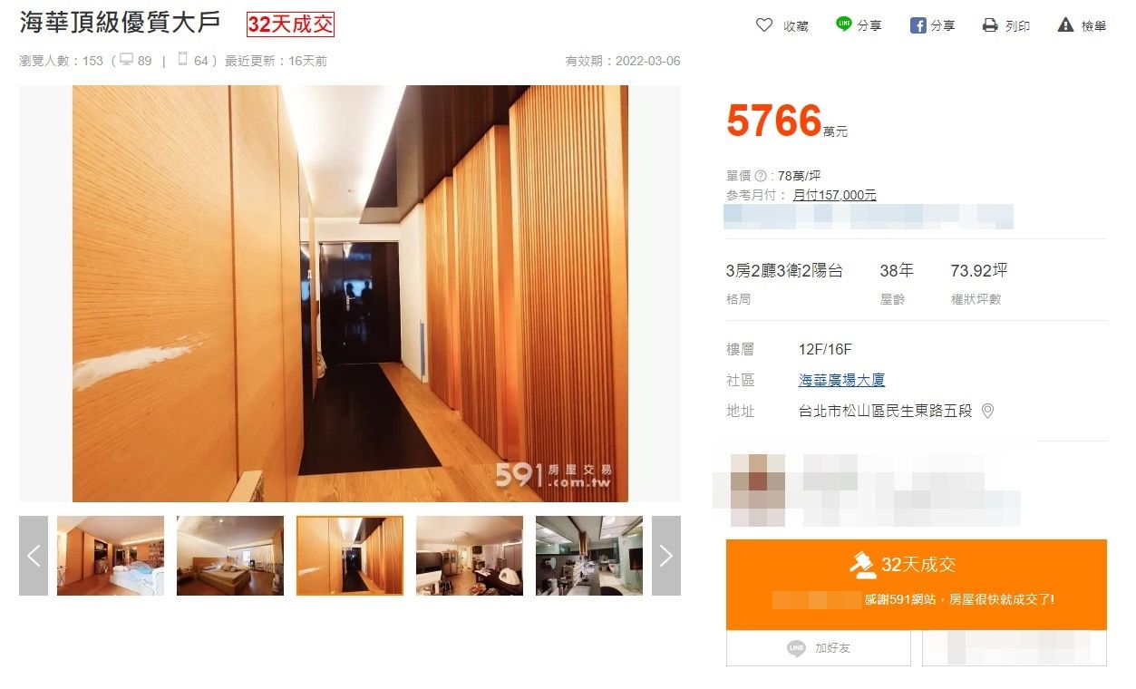 陳建州最近被爆出要變賣位於松山區的豪宅,是坐落於「海華廣場大廈」的12樓,占地總共72坪,格局是3房2廳,還有3衛浴2陽台,雖然年齡已有38年,但室內裝潢看起來屋況依然相當不錯,而且地點也相當清幽方便,鄰近松山機場、民生社區以及河濱公園,進台北市區或郊區都十分方便,房子最後是以「5766萬」的價格成交。