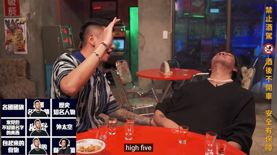 遊戲過程中,瘦子跟喬瑟夫隨著酒精的催化,情緒越來越高漲,瘦子還不時起身放鬆醒酒,避免在鏡頭前喝醉,而一旁的喬瑟夫則是越喝臉越紅,沒想到喝到一半時還不小心嗆到,只見他突然起身離開鏡頭,隨後便忍不住吐在店家地板上,瘦子見狀後便立刻上前關心,表情看起來相當擔心。整理過後,喬瑟夫解釋因為被酒嗆到才會吐,並尷尬表示:「我已經差不多快10年沒有吐在人家地板上,幹超拍謝(抱歉)!」雖然身體不舒服,但兩人還是敬業完成錄影,最終則由瘦子獲勝。
