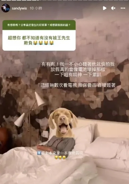 吳姍儒與老公完成婚禮後,便飛往美國與男方家人一起度過農曆新年,這段時間她鮮少更新社群,徹底給自己一個放鬆的時光,直到26日她才在IG開放問答,因此有粉絲表示:「超想你,都不知道有沒有被王先生欺負!」對此,她則開玩笑說:「有有有!我一不小心睡著他就偷拍我!」並貼出一張自己被偷拍的畫面,還不忘用狗狗圖案擋住睡臉。