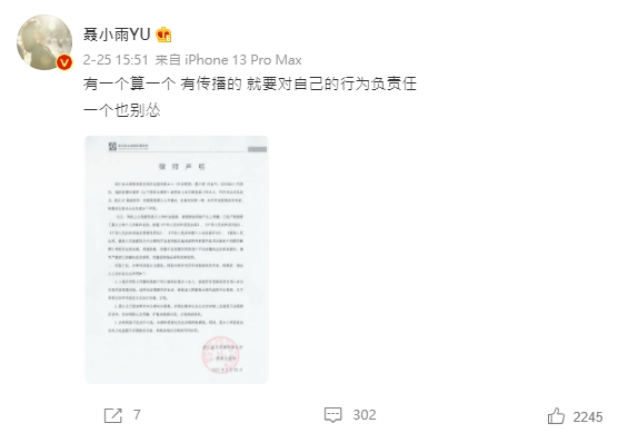 聶小雨目前已委託律師發佈律師函,正在進行蒐證,「有一個算一個,有傳播的就要對自己的行為負責任,一個也別慫。」強調會將散播影片的人吃官司,還自己一個公道。事實上,不雅片流出時,猴哥就曾火速表示大家「只是普通朋友」,痞幼還因為巨大輿論壓力罹患憂鬱症。
