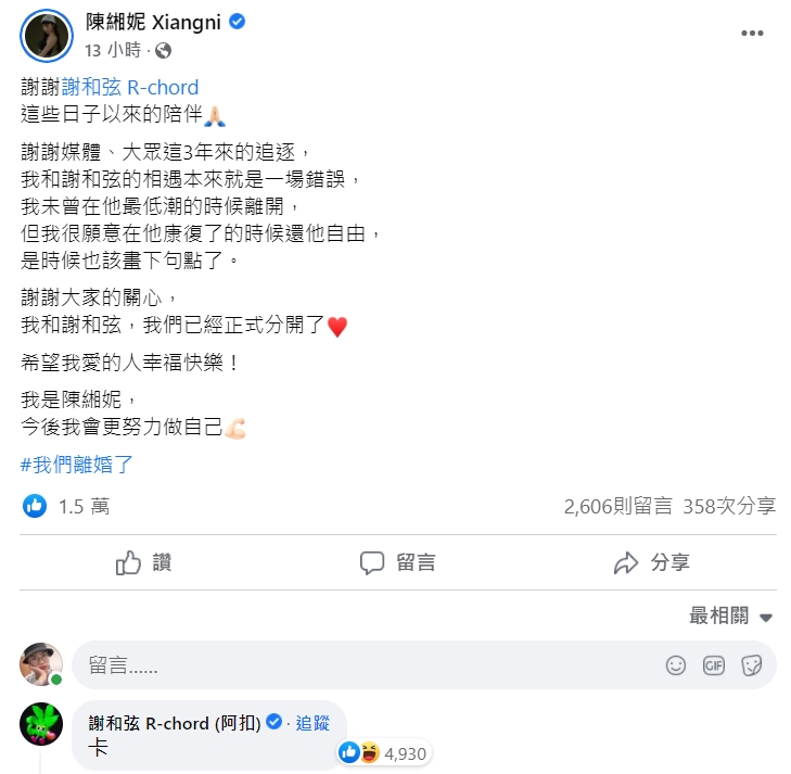 然而,讓許多人感到不解的是,莉婭PO出離婚消息後,謝和弦竟再貼文下方回應「卡」,絲毫不在意的態度,讓人不禁懷疑,「難道又是為了宣傳新專輯的操作手法?」事後謝和弦也沒有正面回應此事,僅間接表示,「私訊報名下一任謝太太」,讓外界相當好奇兩人的婚姻是否真的已經畫下句點。