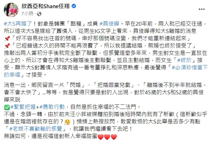 大S與具俊曄的婚事為演藝圈投下一顆震撼彈,卻也招來許多罵名!兩性專家欣西亞則在臉書上發表個人觀點,她認為男方多年來一直將女方放在心上,所以才會在對方離婚後主動聯繫,而且從具俊曄的貼文中使用「終於接受」,可以得知,大S對舊情人的求婚有過掙扎,最後則是因為「必須珍惜當下的幸福才接受」,對於年紀不小的大S及具俊曄來說,「緊緊把握、勇敢行動,自然是抓住幸福的不二法門」。