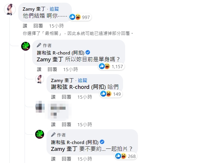 在謝和弦的貼文發出後,意外釣出擁有「LOL電競女神」封號的網紅「奎丁」留言反虧,「他們結婚,啊你⋯」。結果謝和弦居然當場開始把妹,先是反問奎丁「所以妳目前是單身嗎?」奎丁敷衍帶過話題,謝和弦又主動出擊,「要不要約…一起拍片?」