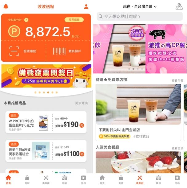當你打開波波送點 app 的頁面,你會發現其中的 「全家專區」,點進去一看:義美厚濃高纖黑豆奶、義美全脂鮮乳、義美無糖台灣四季春,盡是全家超商的超人氣商品!更有可靠消息指出,今年波波送點將跨足美食餐廳領域,可累積折抵的通用店家多達200多間,也與多方知名飲料店、海鮮燒烤、酒吧攜手合作,點數得以發揮的選項激增,最強集點型 app 波波送點果然來勢洶洶。