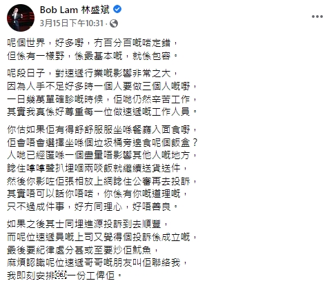香港知名主持人林盛斌(Bob Lam)在TVB接過多檔節目,以高情商聞名,螢幕形象良好。日前林盛斌在社群平台分享,看到一名快遞員因為沒地方吃午餐,在垃圾桶旁吃便當被檢舉,讓他傻眼表示,如果快遞員因此被開除,他願意提供工作給對方,引來網友們一面倒狂推。