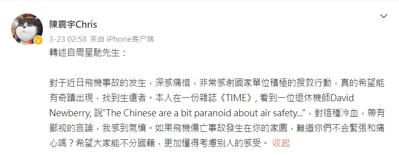 中國東航MU5735航班21日發生空難意外,消息曝光後掀起各界關注,就連港星周星馳也心痛發聲,甚至還公開點名外國機師大衛紐伯瑞(David Newbery),痛批對方說出「中國人對航安有偏執」是冷血的言論,對此,大衛紐伯瑞也作出反駁了!
