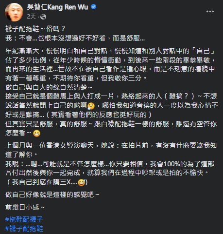 吳慷仁先是發文透露自己認為襪子配拖鞋不會很俗:「也根本沒想過好不好看,而是舒服…」,接著卻突然感性起來,坦言自己隨著年紀越大,逐漸明白和自己對話:「慢慢知道和別人對話中的『自己』佔了多少比例」,從年少時候的懵懂衝動,到後來的畢恭畢敬,到後來世故不再被自己看作是一種心眼:「而是不刻意的禮貌中有著一種尊重,不期待你看重,但我敬你三分。做自己與自大的線自然清楚~。」