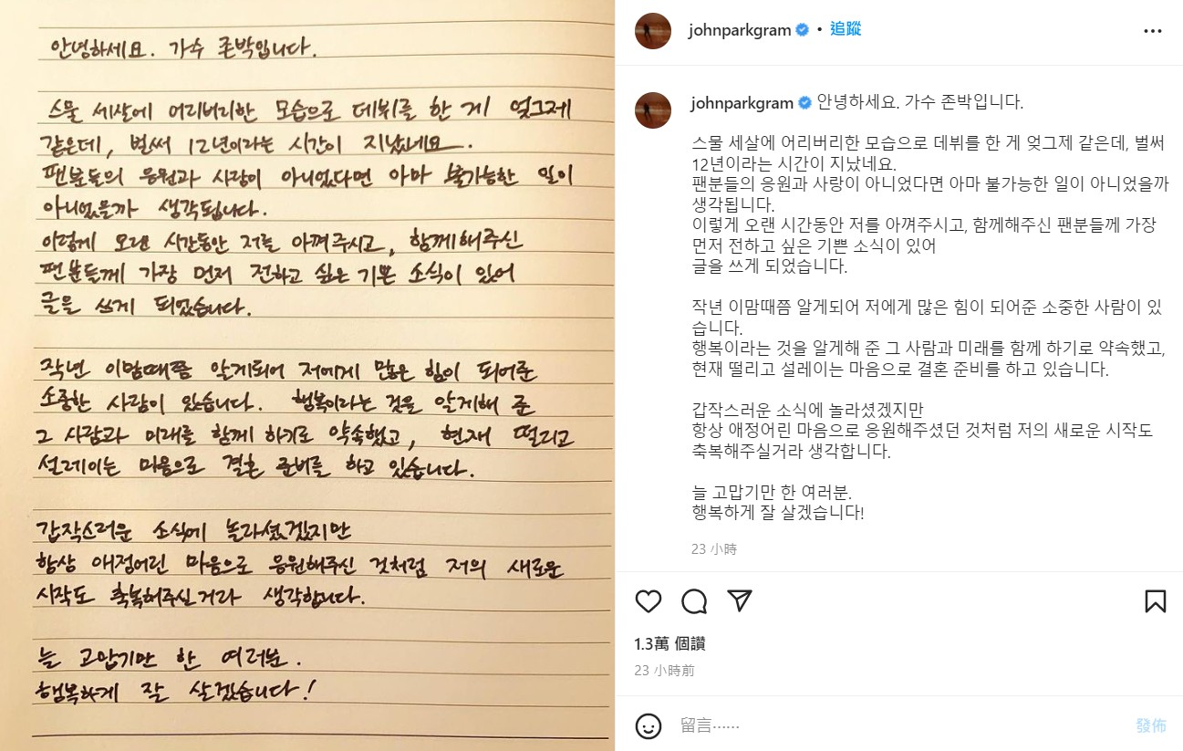 John Park昨(8日)在instagram公開一張手寫信,向外界宣布結婚的好消息:「去年的這個時候認識了一個對我而言很珍貴的人,她一直很支持我,也教會我什麼是幸福,我決定和這個人一起規劃未來。」字句之間充滿了幸福洋溢的氛圍,讓粉絲們都相當驚喜,不過據了解,他目前正在籌備婚禮當中,將在6月12日正式完婚。
