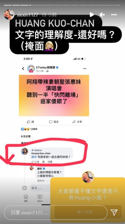 怎料,竟然有酸民在留言區硬要提到謝忻,甚至還標記她的帳號表示:「有跟享翔一起去看阿妹嗎?」沒想到竟然真的釣出本尊回覆:「上面的標題沒看懂?小編會很傷心。」被惹火的謝忻還把留言截圖並PO在IG,「文字的理解度還好嗎」、「大家都看不懂文字,還是只有Huang小姐?」感覺得出來她的滿腔怒火已經快要爆炸!