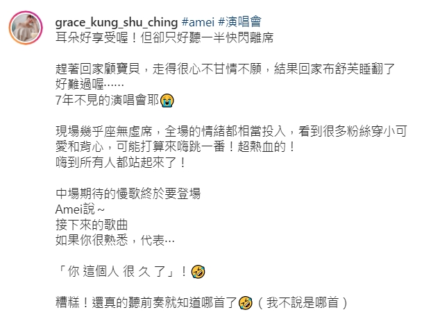 阿翔與老婆Grace日前一同參加張惠妹的演唱會,而Grace則在IG上曬出一系列朝聖的照片並表示:「耳朵好享受喔!但卻只好聽一半快閃離席」,原來是因為夫妻倆還要趕著回家照顧小孩,因此聽到一半只好「心不甘情不願」的提早離場,沒想到回到家後發現小孩早就已經進入夢鄉,讓她忍不住直呼:「好難過喔」, 遺憾的體驗掀起許多網友的共鳴,也被許多媒體爭相報導。