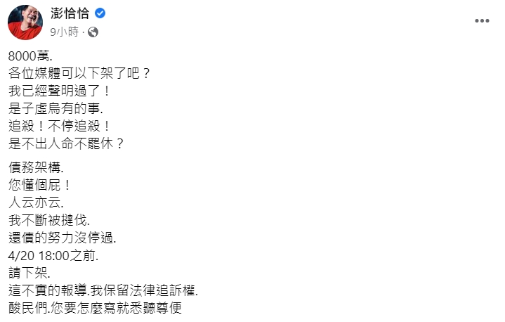 然而,澄清聲明釋出後,負面輿論仍舊持續延燒,澎恰恰忍無可忍並在20日凌晨火大開炮,「我已經聲明過了!是子虛烏有的事。追殺!不停追殺!是不出人命不罷休?」自己這段時間一直努力還清債務,沒想到卻不斷被撻伐,他也下達最後通牒,希望不實報導可以下架,不然會訴諸法律途徑。