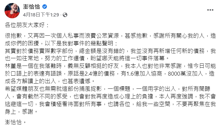 澎恰恰18日遭爆料積欠的債務突然暴增8000萬,他立即出面解釋並強調,「我並沒有再新增任何新的債務!」,原先就只有2.4億的債務,「有1.6億加入協商,8000萬沒加入」,應該只是林秉文口誤說錯,才會導致內容解讀有出入。最後澎恰恰再度強調,「我不會逃避這一切」,懇請外界給予一些空間,我會努力還債。