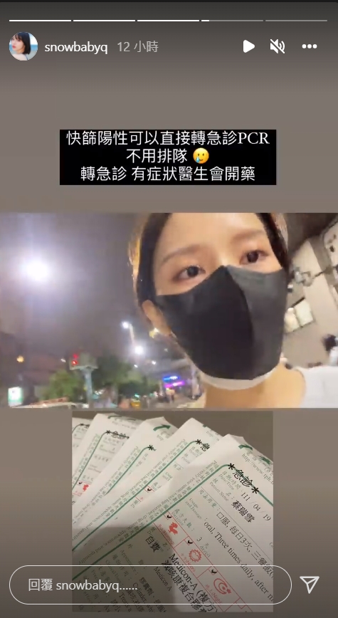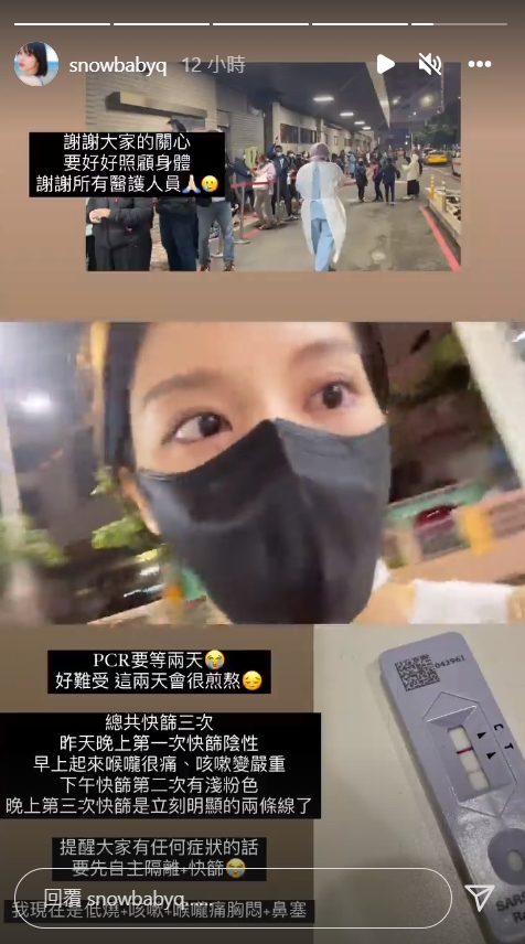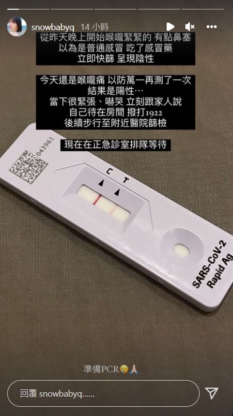 蔡瑞雪19日在IG上發文透露,自己在前一天晚上就有喉嚨不舒服和鼻塞的症狀,原先以為只是單純的感冒,於是先吃了感冒藥,後來為了保險起見還是實施快篩,結果呈現「陰性」,但是隔天症狀依然沒有好轉,於是她再測了一次才發現「由陰轉陽」,當下嚇到哭出來,並立刻聯絡1922,也馬上前往附近醫院做PCR。