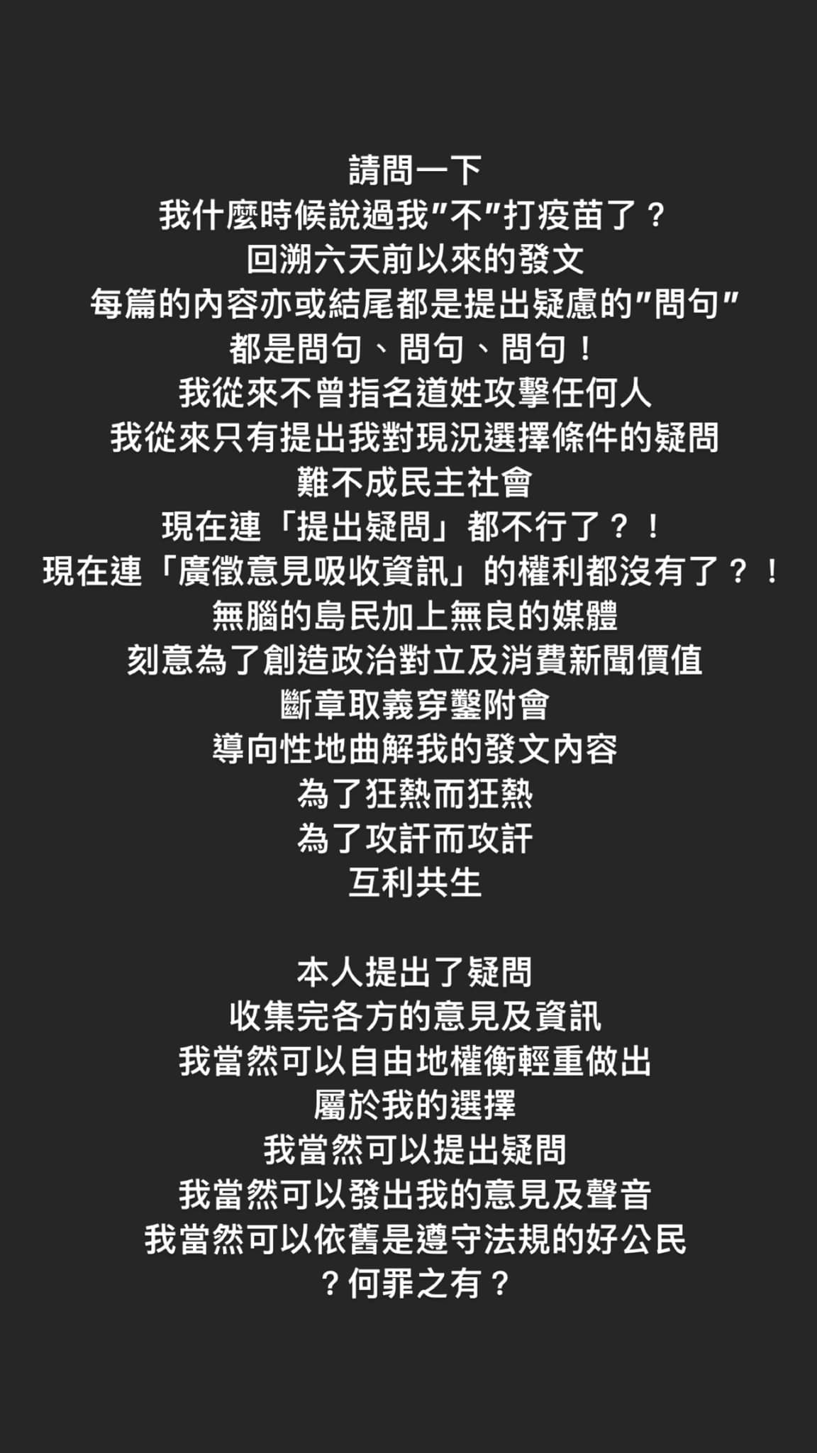 事實上,自從李沛旭公開發表對於防疫政策的不滿後,每天都會收到不少酸民撻伐他,他也曾解釋,自己並非「不打疫苗」,而是在搜集完資料後,單純表達自己對於現狀的不滿及觀點,無奈卻被許多人曲解原意,他還氣到與酸民正面交鋒,感覺得出來他對於酸民的攻擊已經快受不了!