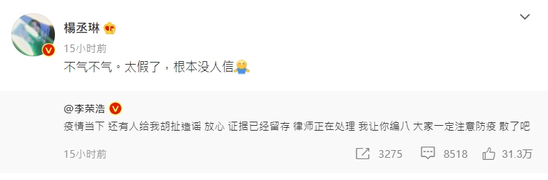三人的貼文曝光後,網友們紛紛留言表示,「真的很離譜,我看了都覺得好好笑」、「那些造謠的一定是生活過得不幸福,只能當鍵盤俠!」、「人家夫妻這兩天才剛給上海捐了物資,這種就不要瞎傳了!」、「啥也不信,就信姐的人品~」。
