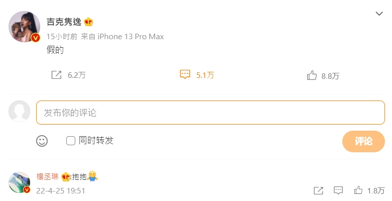 後來,楊丞琳也轉發李榮浩的貼文並表示,「不氣不氣。太假了,根本沒人信!」不僅安撫老公的情緒,也再度駁斥烏龍醜聞!她也在吉克雋逸的微博留言寫下「抱抱」,展現出兩人從《浪姐2》培養起的好感情。事實上,楊丞琳過去曾表示,自己很怕被誤會,還自嘲是「澄清天后」,而這次她並沒有多做解釋,也讓網友秒懂真的就是烏龍一場。