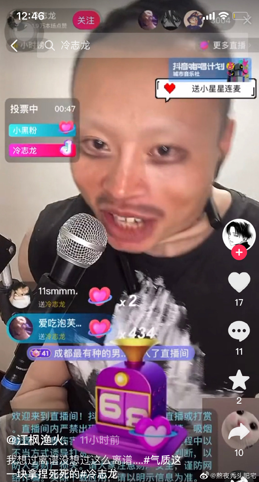 然而先前卻有網友發現,冷志龍在街頭跳舞的壯碩身材竟然是假的,還是網路上所賣的肌肉裝,只是在鏡頭上看起來不明顯,沒想到先前他開直播乾脆不演了,直接關閉濾鏡露臉,她的真面目這才曝光,其實他根本是光頭大叔,過程中他還在眼睛下方畫上黑眼圈,加上不修邊幅的鬍渣,整個人看起來十分崩壞。