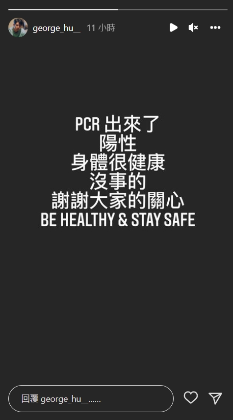 胡宇威在29日傳出快篩陽性的消息,隨後便立即前往醫院做PCR,他也在昨日(30日)透過IG宣布確診消息並表示:「PCR結果出來了,陽性。」為了讓粉絲不必過於擔心,他也自曝身體狀況,「身體很健康,沒事的,謝謝大家的關心!」目前正依照防疫政策隔離中。