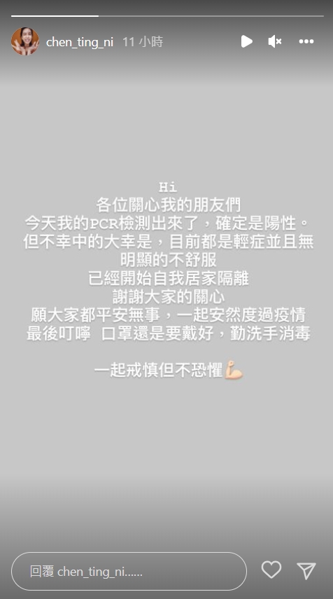 隨著胡宇威傳出確診消息,陳庭妮的身體狀況也同樣受到外界的關注,不幸的是,她也在30日宣布「確診」,並公布自己的身體狀況,「不幸中的大幸是,目前都是輕症並且無明顯的不舒服,已經開始自我居家隔離,謝謝大家的關心。願大家都平安無事,一起安然度過疫情!」最後還不忘提醒大家要勤洗手、戴口罩,保護好自己。