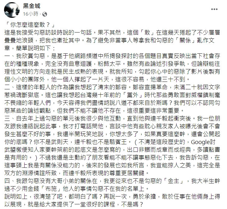 接著,黑金城也表示,自從去年與勾惡合作就很少互動,「直到他與連千毅起衝突後,我一位朋友跟我連絡說起此事,我才打電話問他」,他表示勾惡坦言擔心自己的事情會影響到家人,也害怕家人被起底會不會發生不好的事情,了解到勾惡的狀況後,他選擇主動介入勾惡與連千毅的紛爭,希望能讓事情迎來轉機。