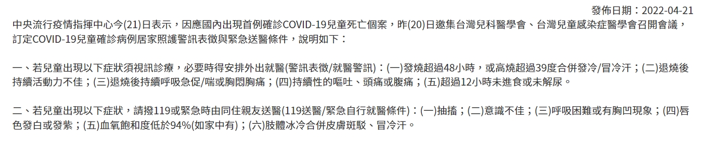 另外,台灣兒童醫學會日前宣布「如何判斷兒童確診的六大警訊」,第一,孩子年齡小於一歲需要多加觀察;第二,持續發燒超過48小時,或發燒之餘又有發冷、冒冷汗、冷顫等症狀,剩下分別是活動力下降、持續嘔吐、食慾下降,以及退燒之後仍會呼吸急促、胸悶胸痛等,如有以上症狀就有可能是確診新冠肺炎,要盡早前往治療。