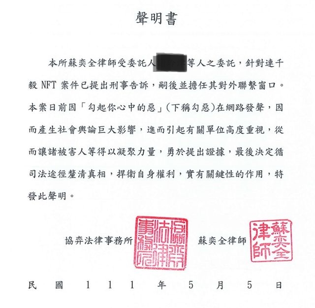 「勾惡」在5日深夜透過Instagram發文,曬出一張「訴訟聲明書」,透露NFT事件的受害者,已經向連千毅提出刑事告訴,「替代役小屁孩已經幫你們開了一條路,剩下的,畢竟我不是當事人,所以沒有辦法代替你們走!」,不過他也向這些受害者喊話,「我相信,正義頂多會遲到,可是從不缺席」。