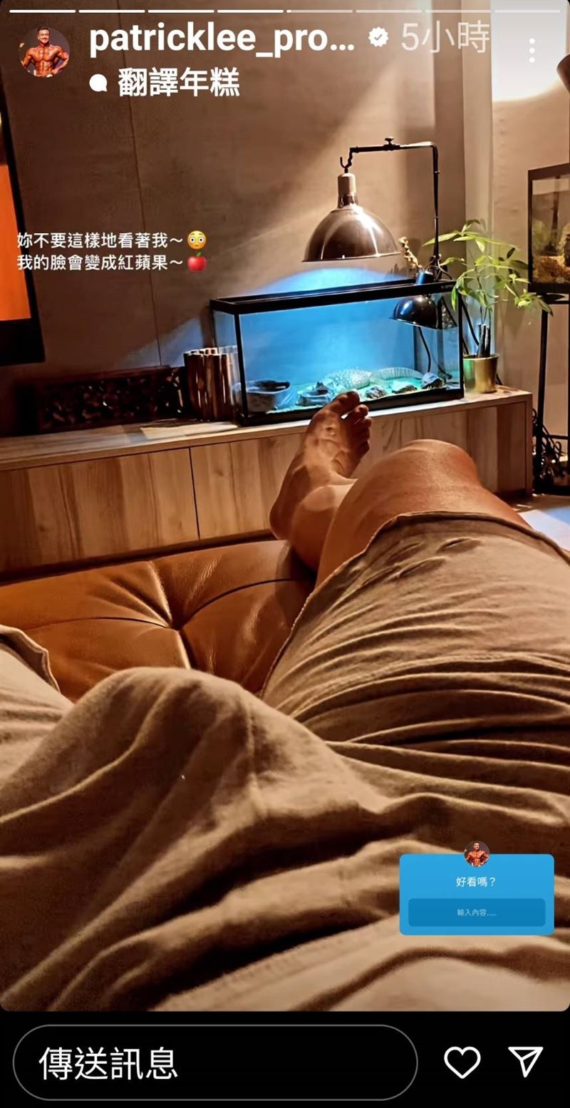 李沛旭昨(6日)在Instagram的限時動態中開放問答與網友們互動,其中一張他曬出了自己躺在床上,往床尾拍攝家中寵物蜥蜴的畫面,照片中蜥蜴也剛好盯著他看,因此李沛旭也在一旁引用徐懷鈺的歌《我是女生》寫下:「妳不要這樣地看著我~我的臉會變成紅蘋果~」但畫面左下角卻明顯看到他拍下自己褲襠下有一大包的隆起物,此外李沛旭還在一旁放了一個對話框詢問網友:「好看嗎?」意有所指的互動方式讓不少網友都嚇翻。