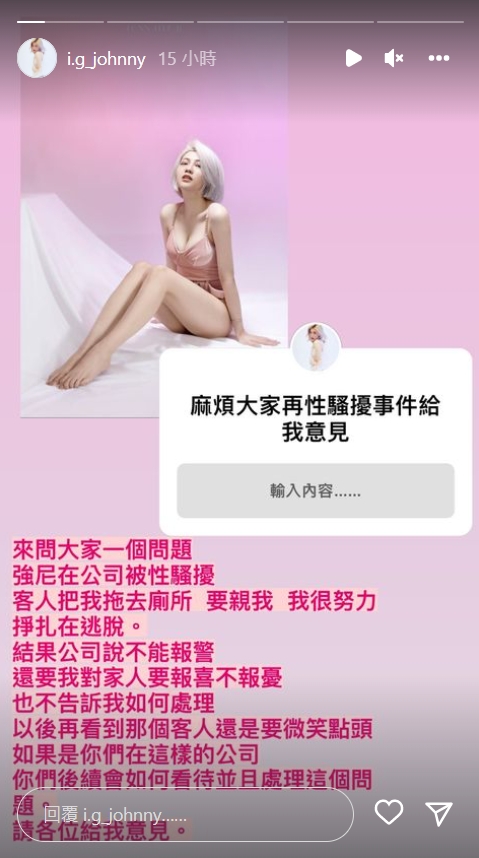 御姐強尼10日透過IG限時動態發文表示,自己在公司被客人「性騷擾」,當時客人把她拖進廁所後,連續兩次拉下她的口罩並想要強吻,幸好在努力掙扎後逃過一劫!更扯的是,公司得知消息後,竟沒有幫忙處理,反而要求她「不能報警」,也不准對家人透露,甚至還要她以後看到那位客人「還是要微笑點頭」,讓她氣到上網詢問網友意見,希望能有所幫助。