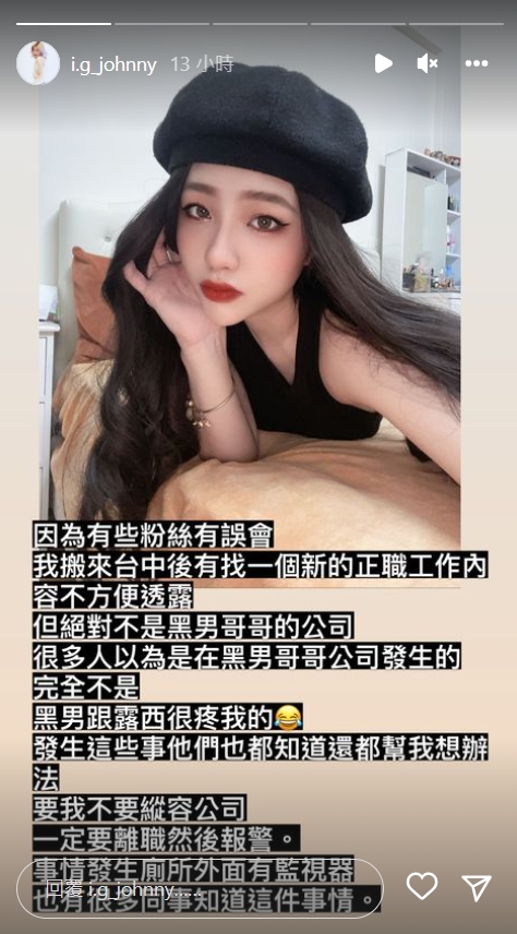 消息曝光後,粉絲們都感到相當震驚,只是不少人都誤以為她說的事情是在黑男經營的網紅公司所發生!對此,御姐強尼也解釋,這件事是發生在她搬到台中後找到的新正職工作,「絕對不是黑男哥哥的公司」。她也透露,黑男得知後也感到憤憤不平,還提供了許多意見,「要我不要縱容公司,一定要離職然後報警!」